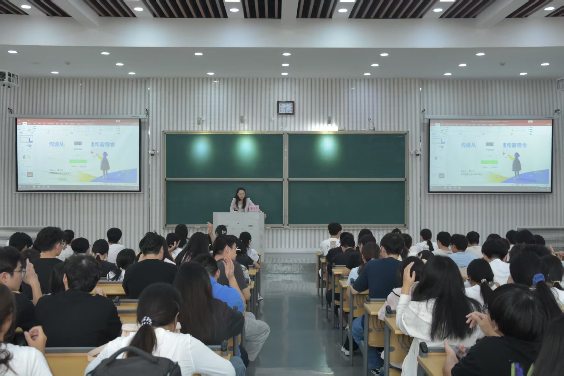 会议伊始,董老师以沟通之差引入,结合专业知识从四个方面阐述了非暴力沟通,通过“你”“我”语句的对比引导学生认识如何委婉表达需求。随后,她结合生动有趣的案例介绍调解冲突的技巧,讲解宿舍公约制定的方法,并给出危机预警信号清单。董老师强调,心理委员和宿舍长是同学身边的心灵守护者,日常工作中多一份细心观察、多一次耐心沟通,就能为宿舍和谐、校园心理安全多添一份保障,希望大家把学到的技巧用在实处,用沟通架起互助桥梁。