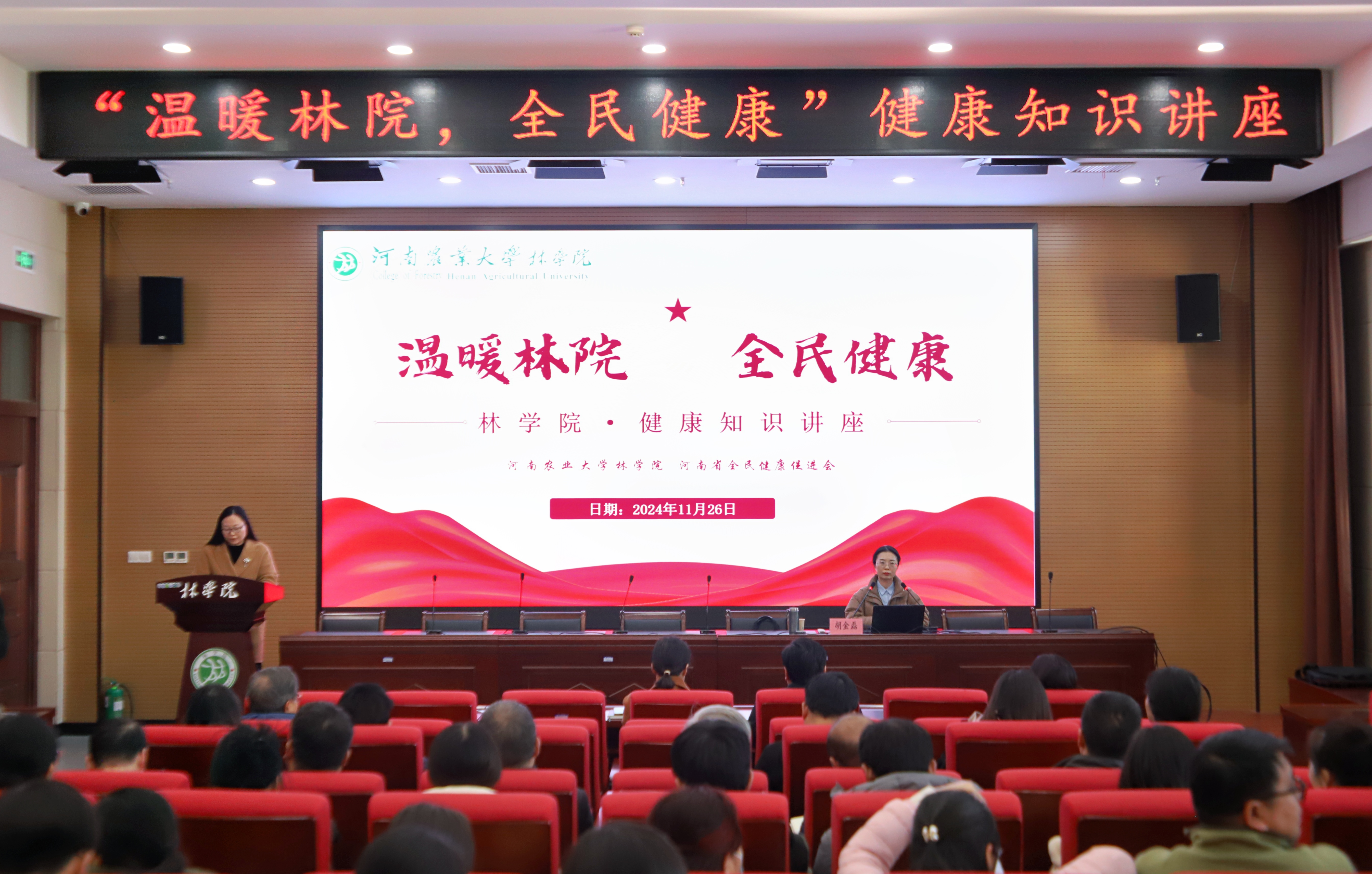 11月26日,巨乳a片 于力行楼南428报告厅举办“温暖林院,全民健康”健康知识讲座。本次讲座由河南省全民健康促进会健康教育委员会成员、河南省安全健康教育中心宣教办主任胡金磊担任主讲嘉宾。院党委书记化青报、院党委副书记王娟、副院长张学芳、副院长李喜梅出席本次讲座。巨乳a片 全体教职工及学生代表参加本次讲座。