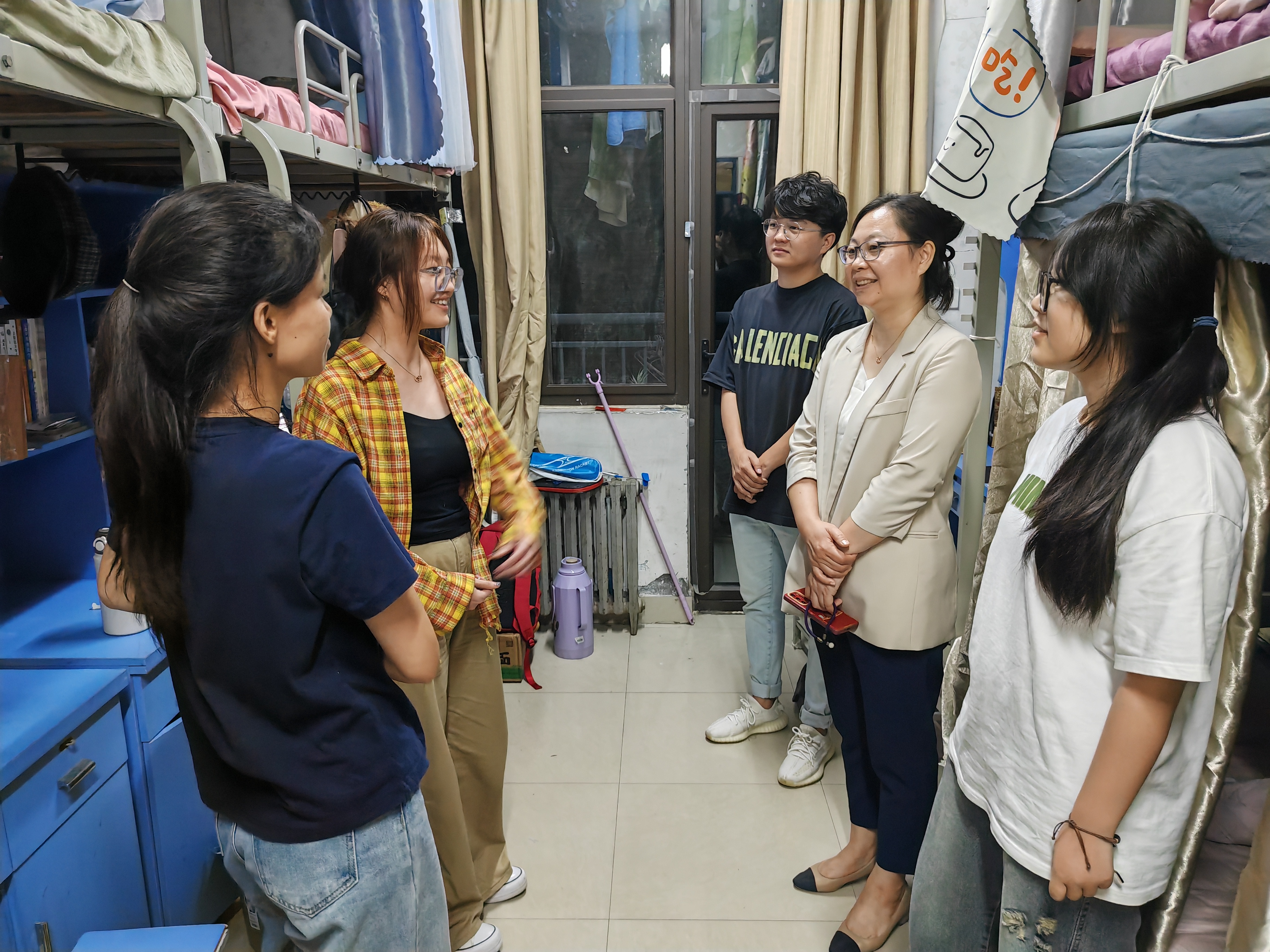 走访过程中,学院领导与学生展开了深入且亲切的交流,对学生们的生活习惯、学习状态,以及学生们在宿舍生活中遇到的具体问题进行了详细询问,并认真听取了学生们对宿舍环境、设施设备等方面的意见和建议。同时也提醒同学们,要调整好作息时间、安排好新的学期规划,营造积极健康的宿舍氛围,以良好的精神风貌投入到新学期之中。学院领导们的关心和询问,极大地提升了学生们对新环境的适应信心。