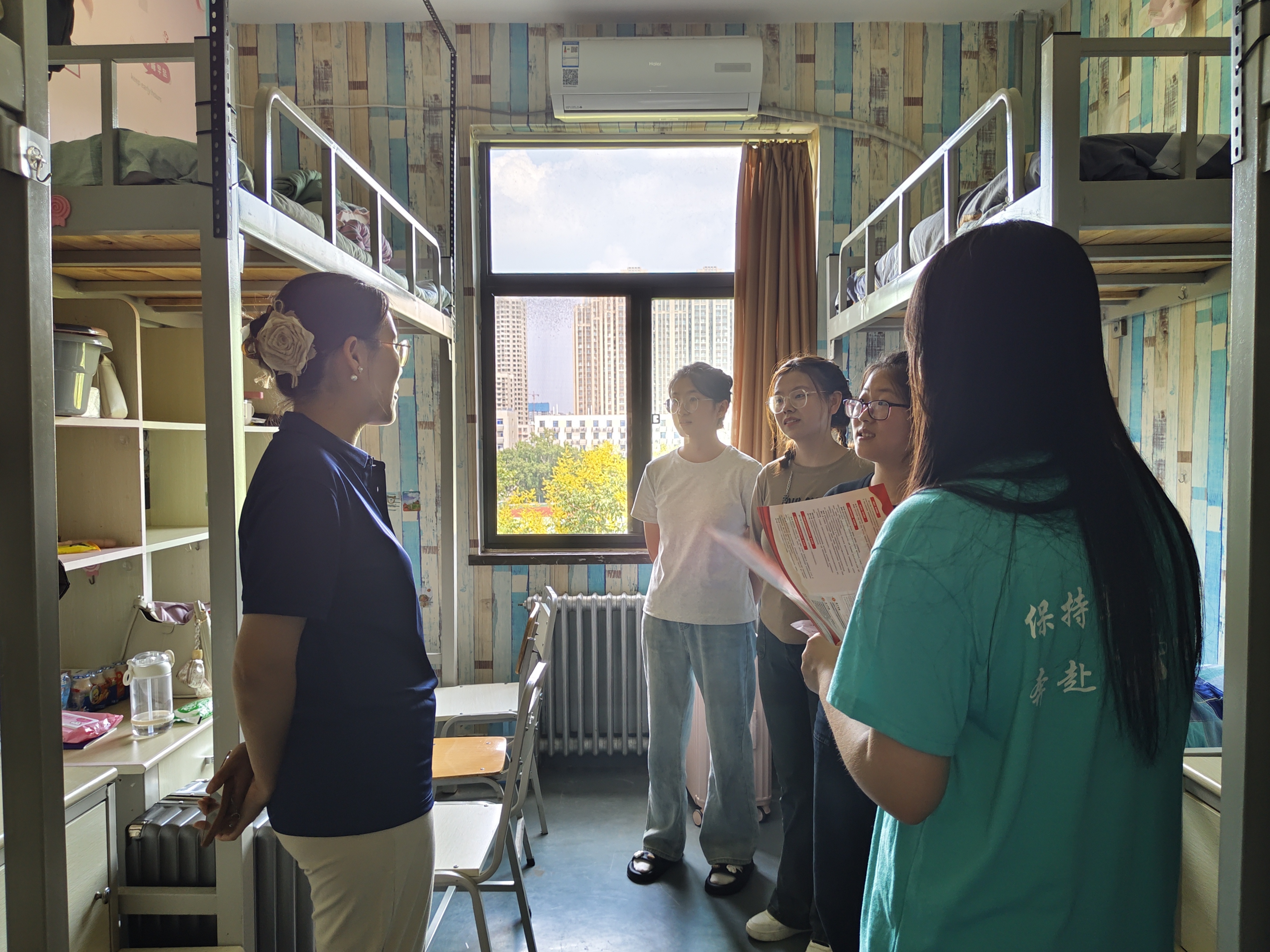 迎新期间,院党委书记化青报一行心系23级新生入住情况,亲自走访新生宿舍,询问宿舍设施问题,关心新生需求情况,用细致入微的服务温暖新生。