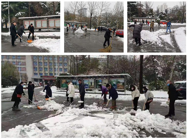 教职工和研究生干部齐心协力,有的拿铁锹奋力铲雪,有的拿扫把清除积雪,为师生们的安全畅通出行提供了便利条件。