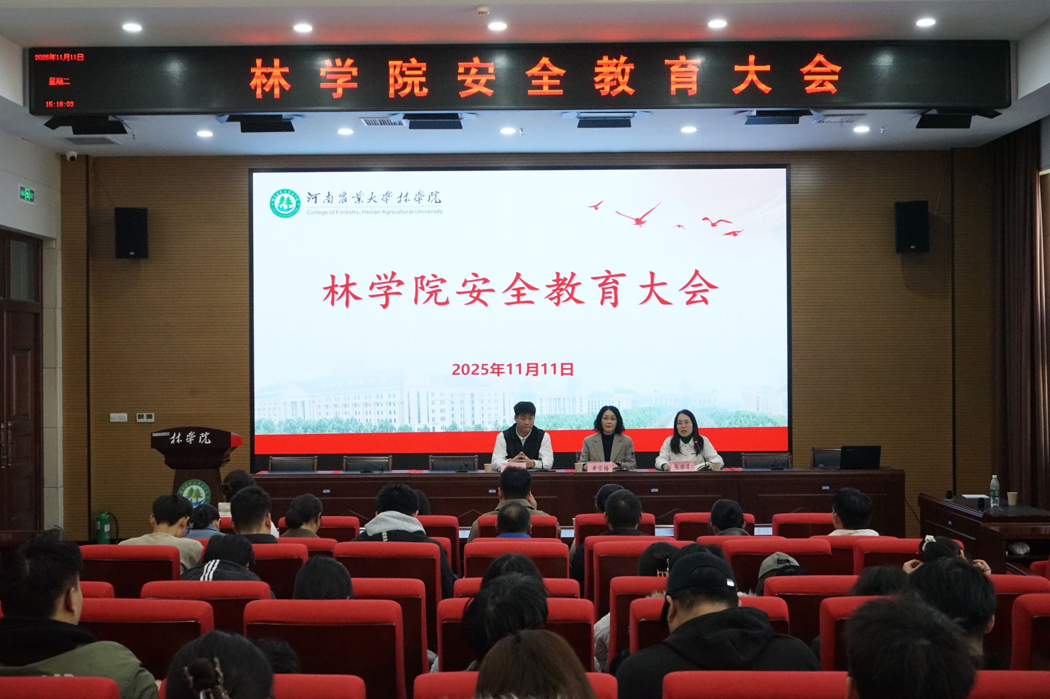 于力行楼428报告厅召开学院安全教育大会并开展消防安全演练活动。校实验室与设备管理办公室副主任黄宗梅、河南省消防协会教员吴昊森、副院长张学芳出席会议,学院师生代表参加本次会议,会议由张学芳主持。