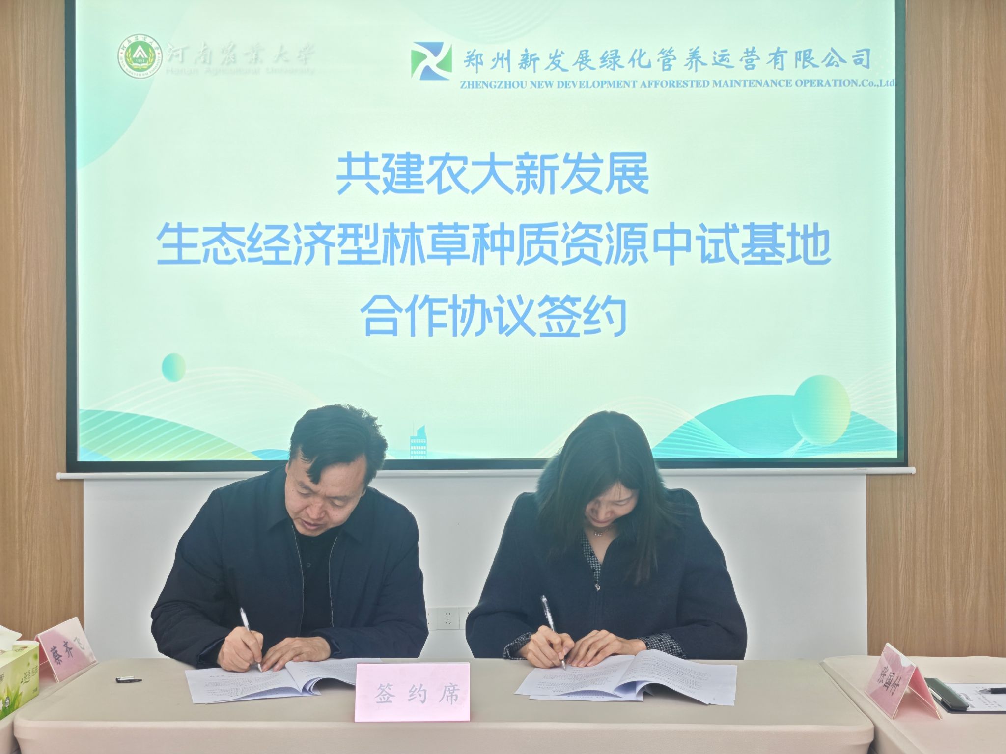 本网讯(通讯员 李志) 11月26日下午,学院与郑州新发展绿化管养运营有限公司在郑州新发展公司会议室成功举行共建“农大新发展生态经济型林草种质中试基地”合作协议签约仪式。签约仪式由郑州新发展公司经理李海涛主持。