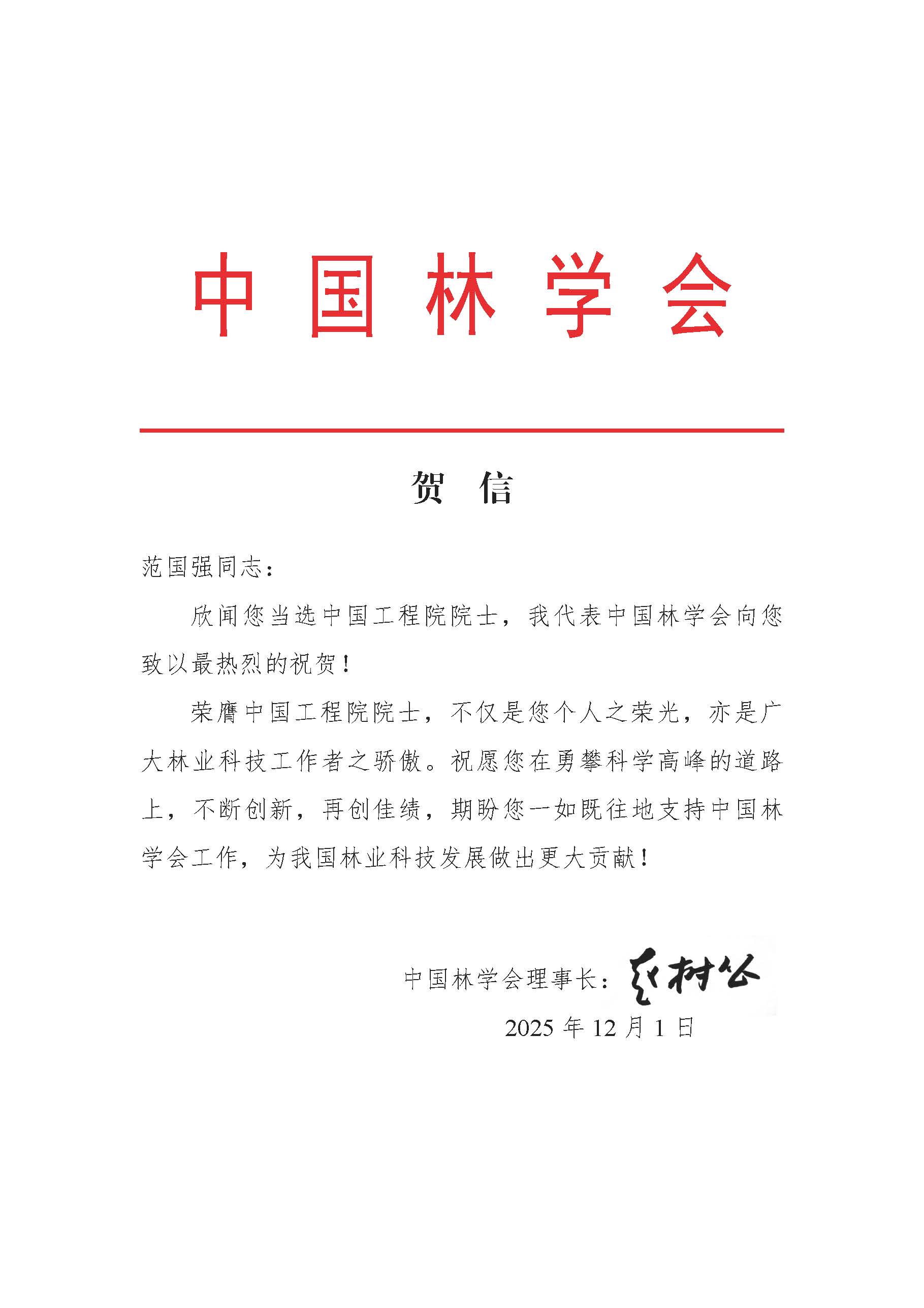 中国林学会赵树丛理事长致范国强院士贺信