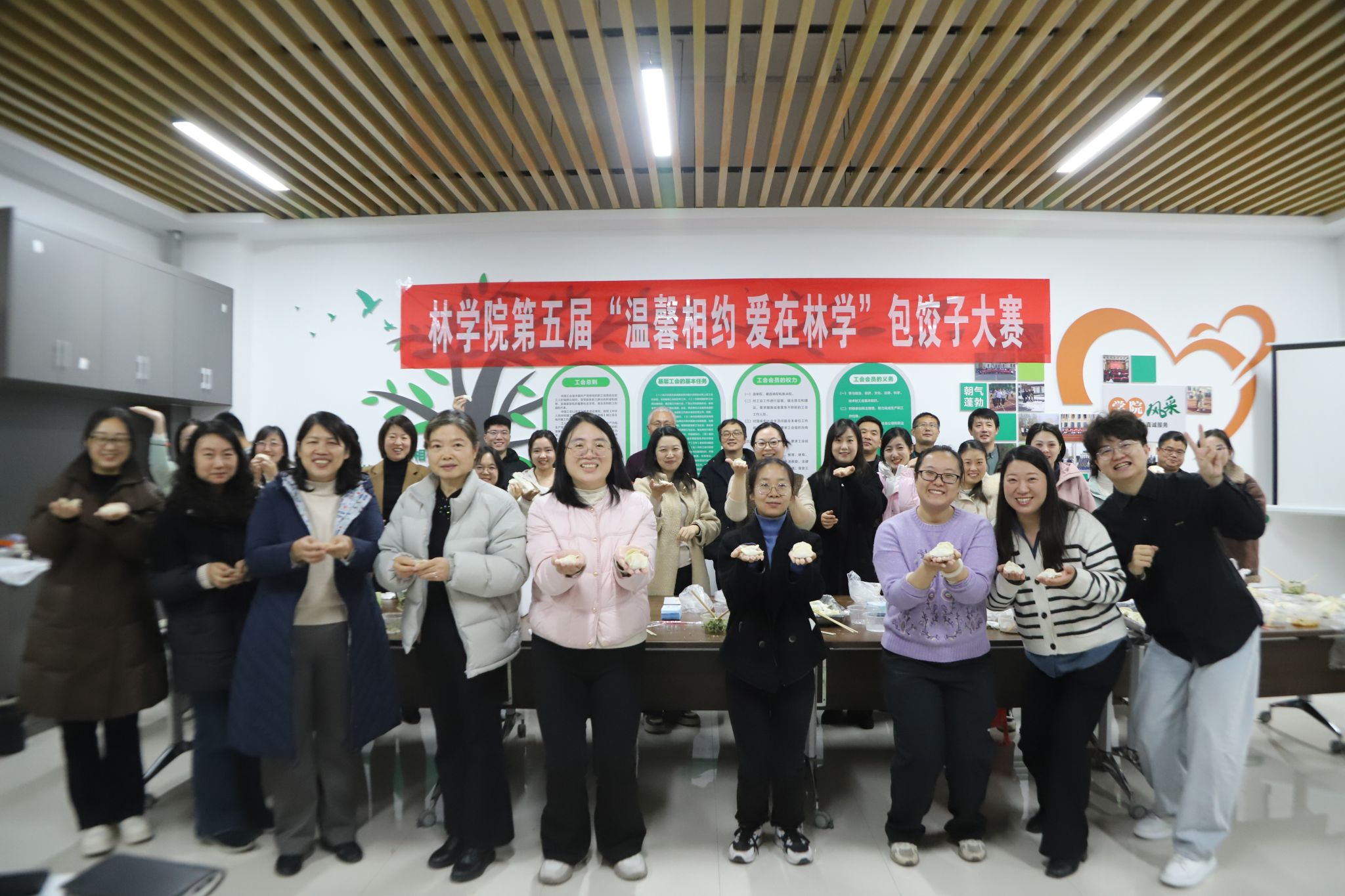 于力行楼-南-247举办第五届“温馨相约 爱在林学”包饺子大赛。院党委书记化青报、院党委副书记王娟、副院长张学芳及学院教师代表参加本次活动。