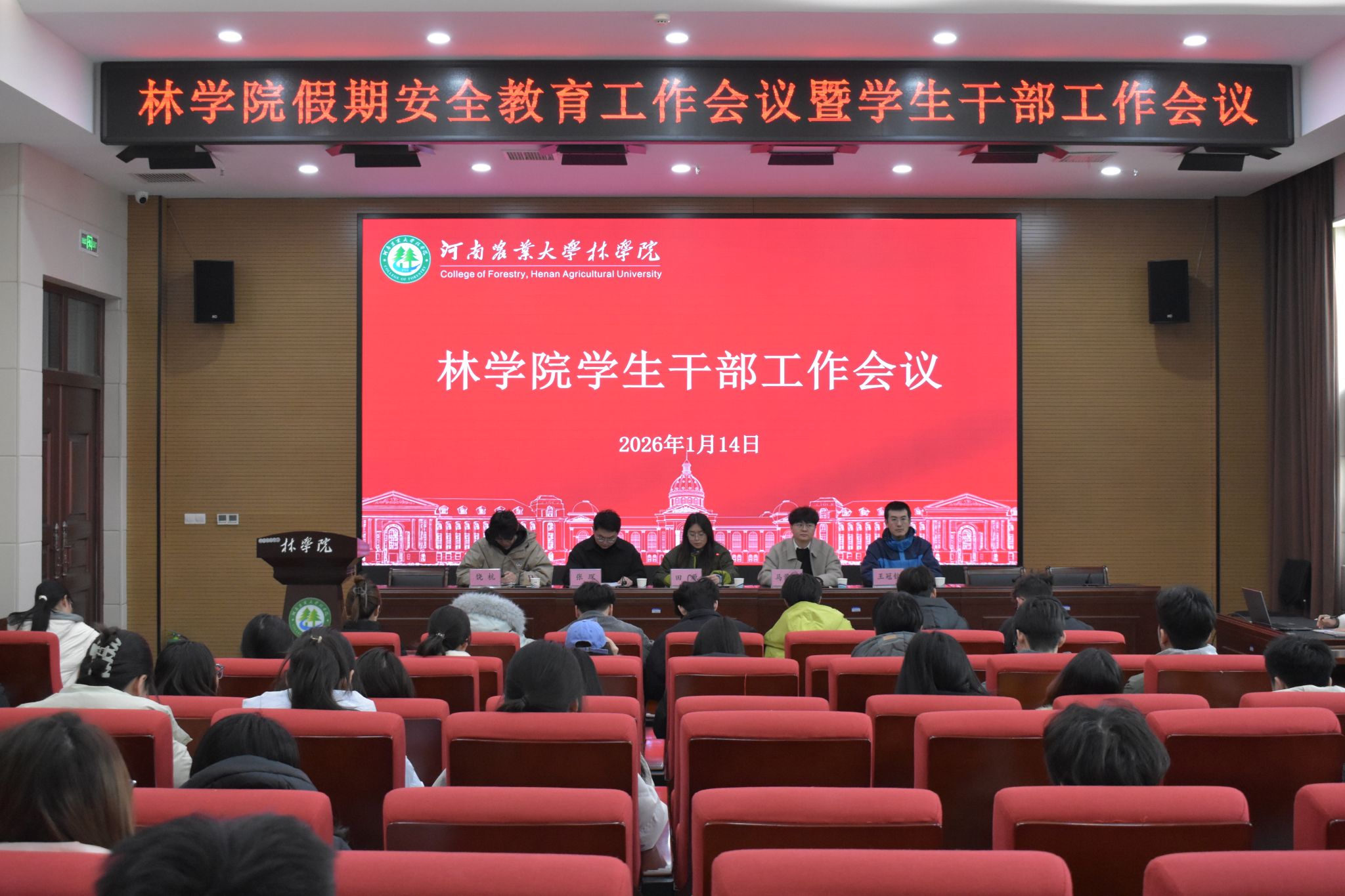 于龙子湖校区力行楼南428报告厅召开假期安全教育暨学生干部工作会议。院团委书记田原,副科级组织员马蒙恩,副书记张琛,院团委老师王冠钦、饶杭及全体学生代表参加此次会议。
