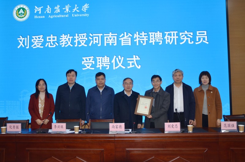 刘爱忠教授对学校的聘任表示衷心感谢。他表示,河南农业大学是一所有着百年历史的学校,具有深厚的学术积淀,良好的学术声誉和较高的办学水平,自己一定会尽快融入工作环境,在学科建设、科学研究等方面发挥作用,服务学校“双一流”建设。
