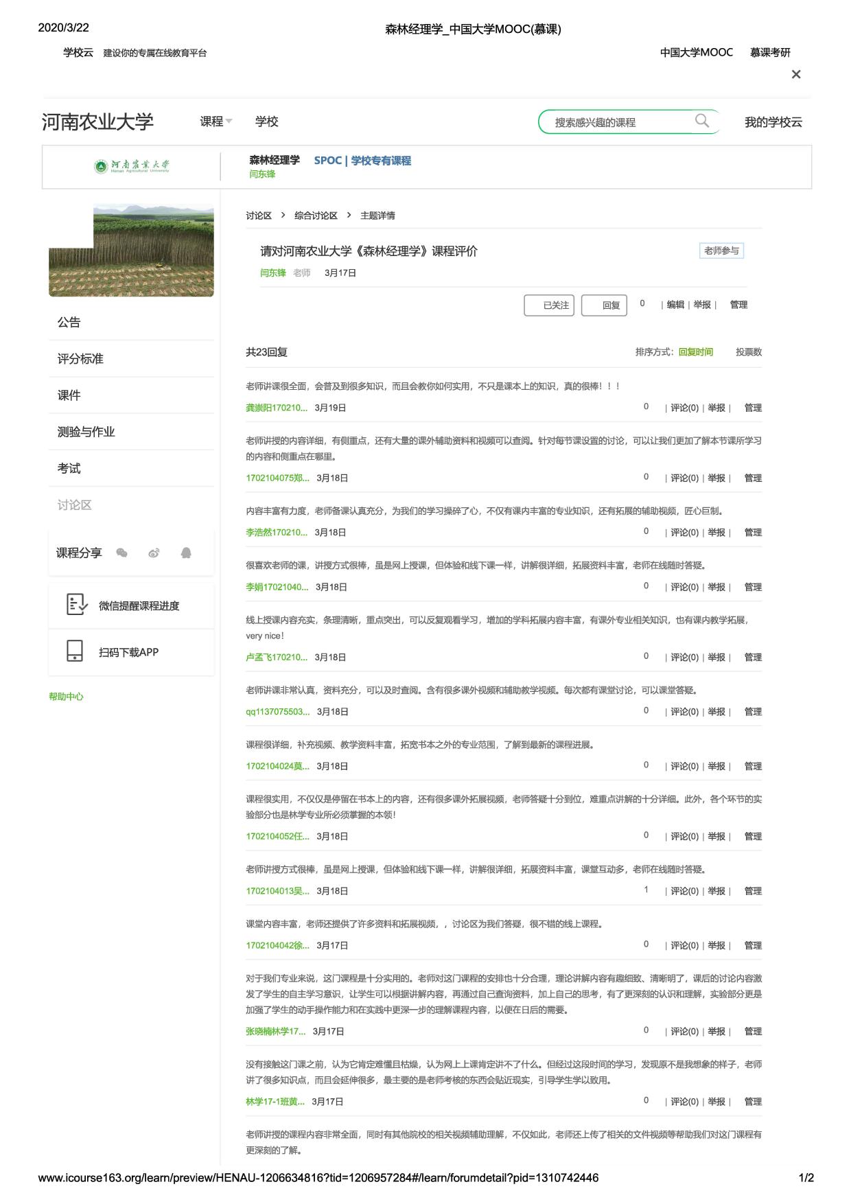 学生对闫东峰老师的《森林经理学》课程评价