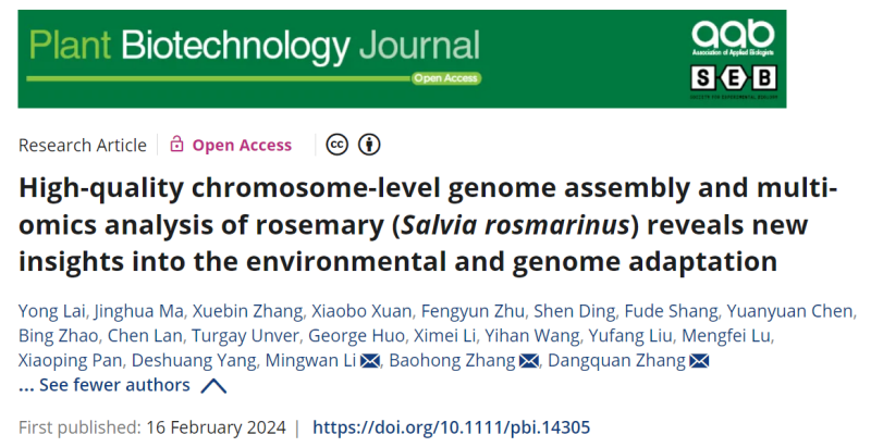 张党权教授团队在植物科学领域国际著名期刊《Plant Biotechnology Journal》在线发表了题为《High-quality chromosome-level genome assembly and multi-omics analysis of rosemary (Salvia rosmarinus) reveals new insights into the environmental and genome adaptation》的研究性论文。该论文构建了迷迭香高抗性新品系的高质量基因组,并对其富含高活性抗氧化物质的分子基础及应对不良环境的分子机制进行了研究,为迷迭香抗性和品质的双重提升提供了新的思路。