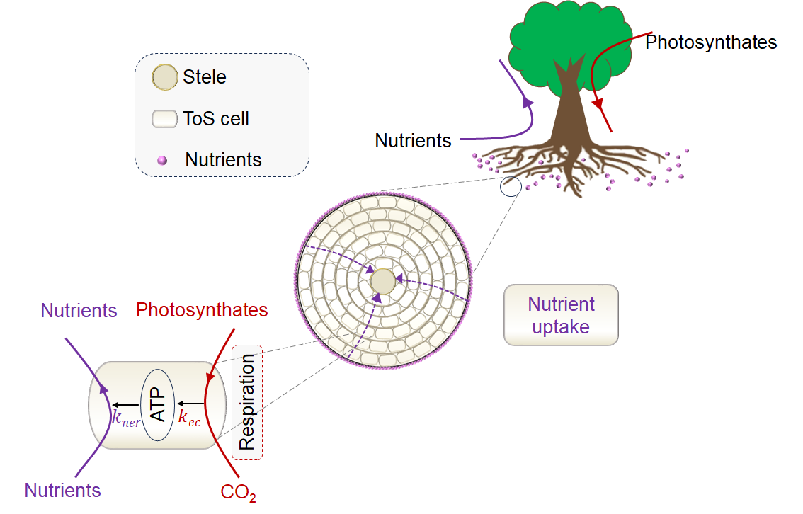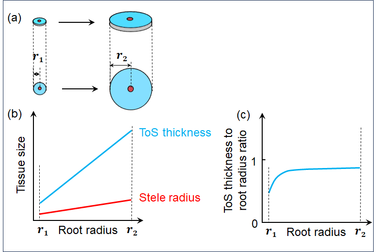 根系是陆地植物赖以生存的基石。当前的研究表明,根系执行吸收和运输功能的两个关键组织呈异速生长关系:随吸收根直径的增加,中柱外组织(ToS,负责物质吸收)厚度的增速远大于中柱半径(负责物质运输)的增速,此即“根结构异速关系”(图1)。这种异速关系是我们认识根系结构与功能的“阿基米德之仗”,在根系研究中有举足轻重的作用。